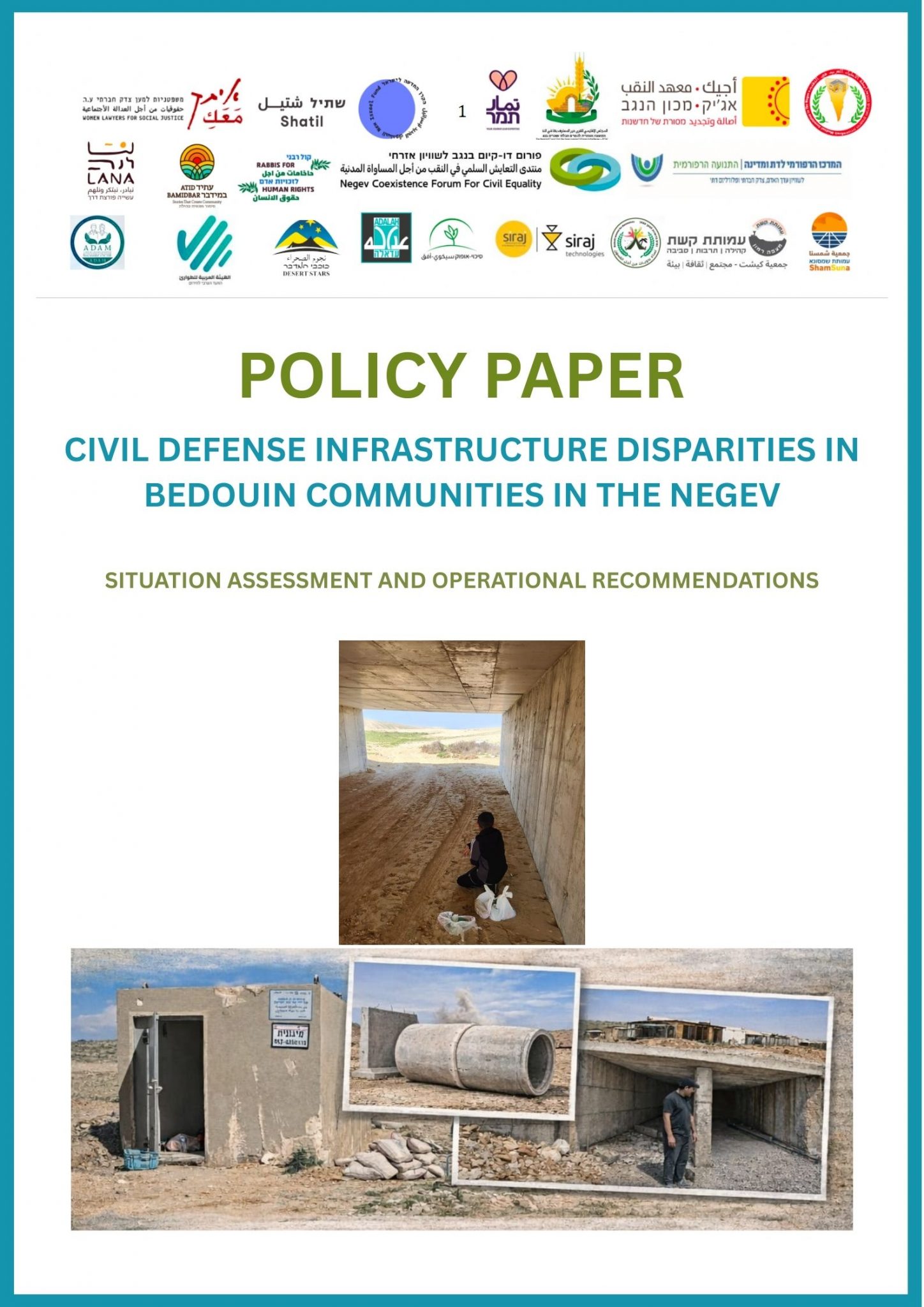 This policy paper, prepared by the Negev Emergency Room / civil society coalition including the Negev Coexistence Forum and partner organizations, is addressed to the Government of Israel, relevant ministries, and emergency authorities.It highlights the lack of shelters in Bedouin Arab communities in the Negev, emphasizing that many homes and schools, especially in unrecognized villages, lack protection from rocket attacks. It argues that these disparities stem from policy failures and calls for urgent government action to provide shelters, enhance warning systems, and ensure equal protection for all residents.